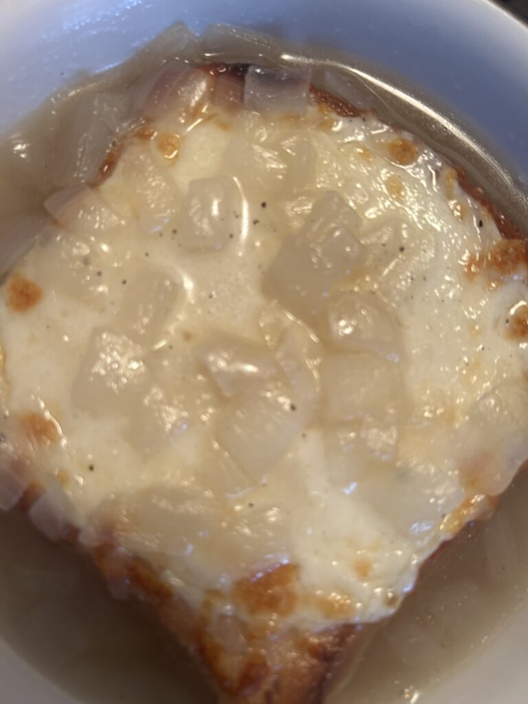 Once Done, place in an oven proof bowl I take a piece of bread and cover it in shredded Mozzarella Cheese and pour the HOT Onion Soup over and serve