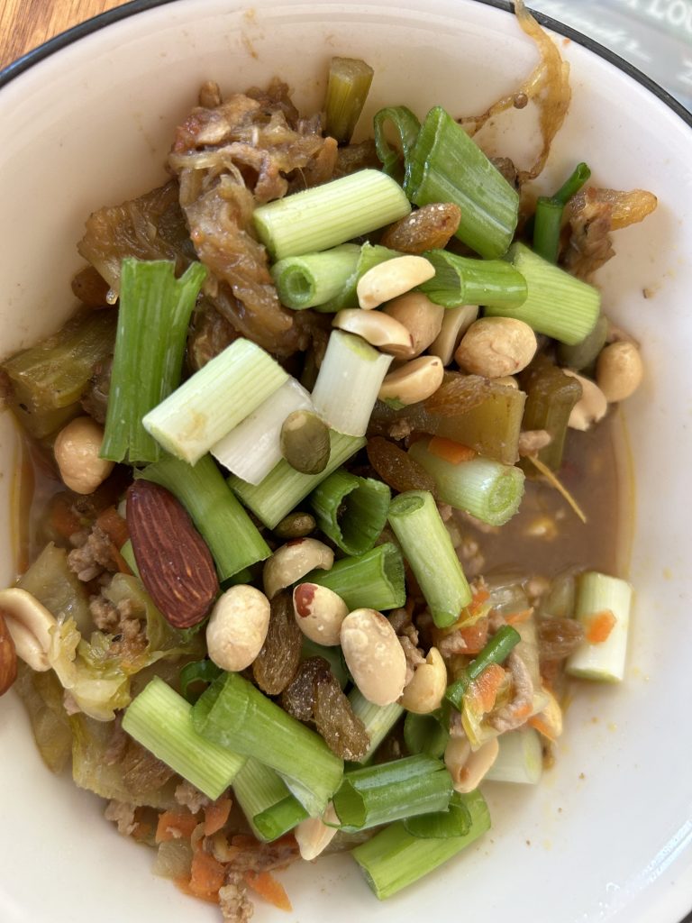 Serve topped with 3 sliced green onions and Peanuts (optional)
